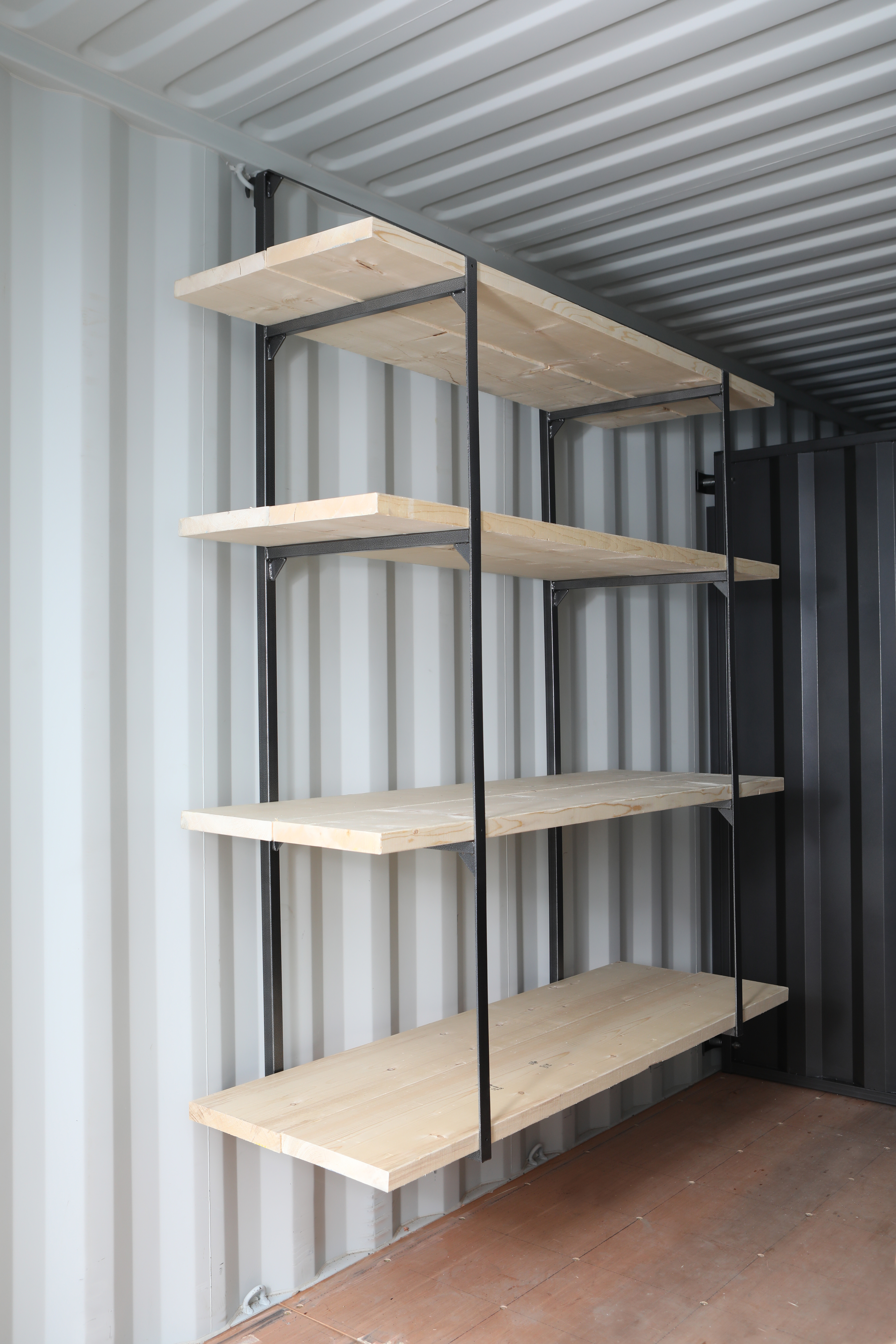 The INSTA Deep 4-Shelf Bracket delivers superior strength while not being bulky or heavy. The brackets provide immense shelf space and rigid stock storage without interfering with valuable floor space. The brackets pay for themselves in labour saving the first time they are used, simply hook the bracket onto the shipping container D-rings and start storing. This bracket has four tiers and uses two 2×12 pieces of construction grade wood per shelf providing a 22.5″ deep shelf. Two bracket units are required to make a complete shelfing system giving you 2400 lbs. (1.2 ton) loading capacity. Adding an additional #4212R INSTA 4-Shelf Bracket unit increases loading capacity to 3600 lbs. (1.8 tons).